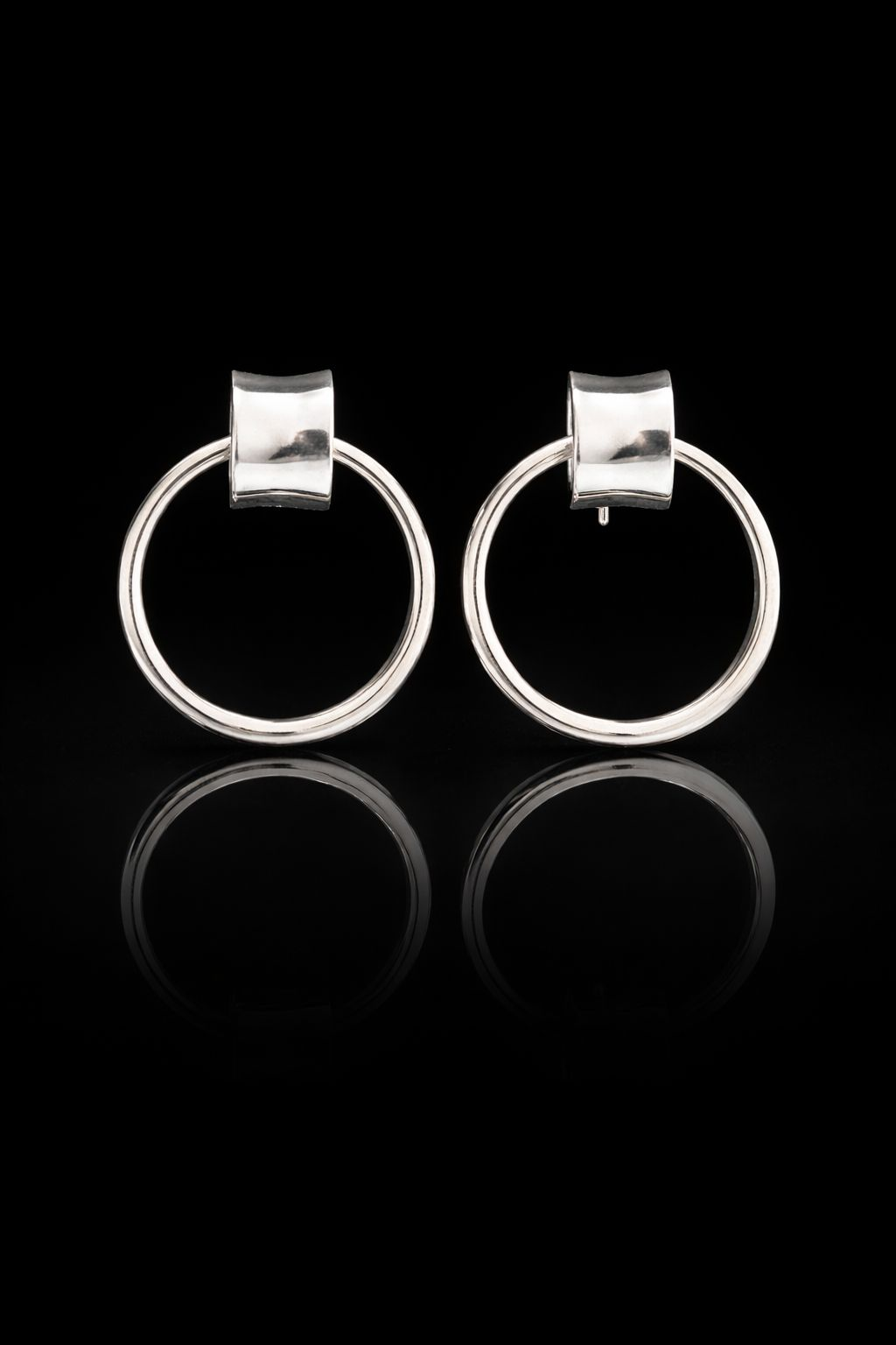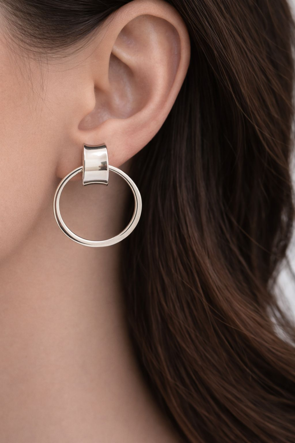 Eleganckie kolczyki wykonane z wysokiej jakości srebra próby 925. Klasyczna forma koła została przełamana nowoczesnym, geometrycznym elementem przy zapięciu, co nadaje całości wyjątkowego charakteru.