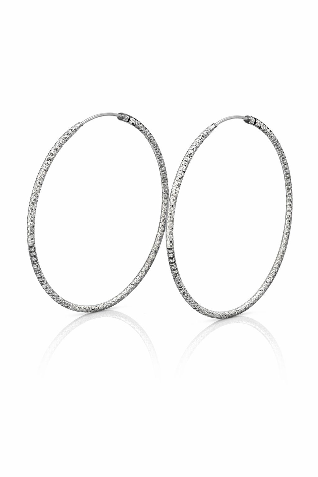 Eleganckie kolczyki w formie kół wykonane z wysokiej jakości srebra próby 925. Powierzchnia została subtelnie diamentowana, dzięki czemu kolczyki efektownie połyskują i przyciągają wzrok, zachowując jednocześnie klasyczny, ponadczasowy charakter.
