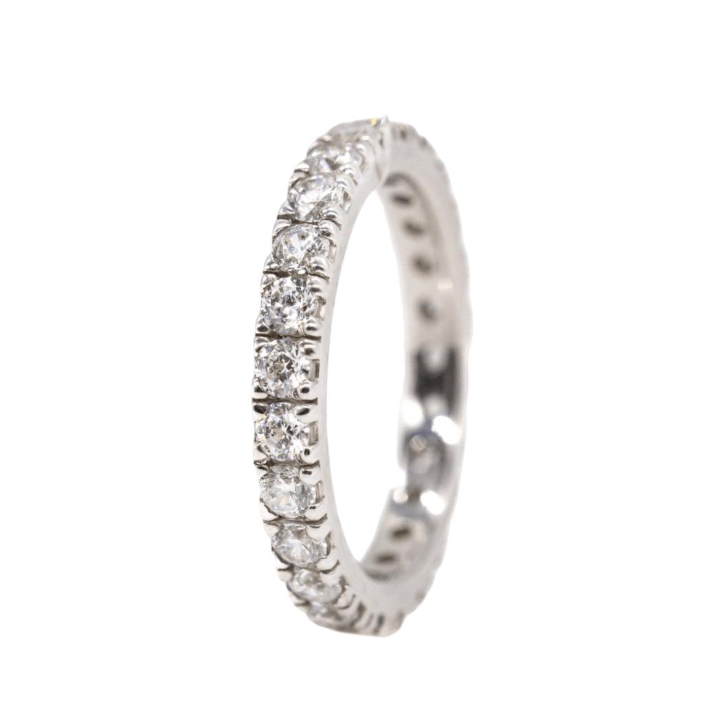 Srebrny pierścionek w formie obrączki wysadzanej cyrkoniami dookoła.
