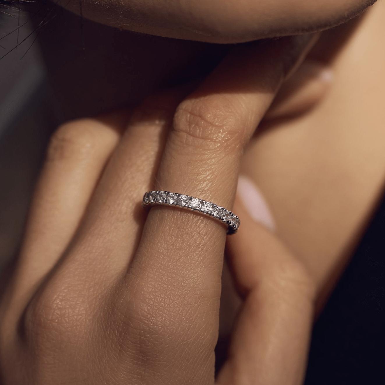 Srebrny pierścionek wykonany z wysokiej jakości srebra 925, w formie obrączki wysadzanej błyszczącymi cyrkoniami dookoła.