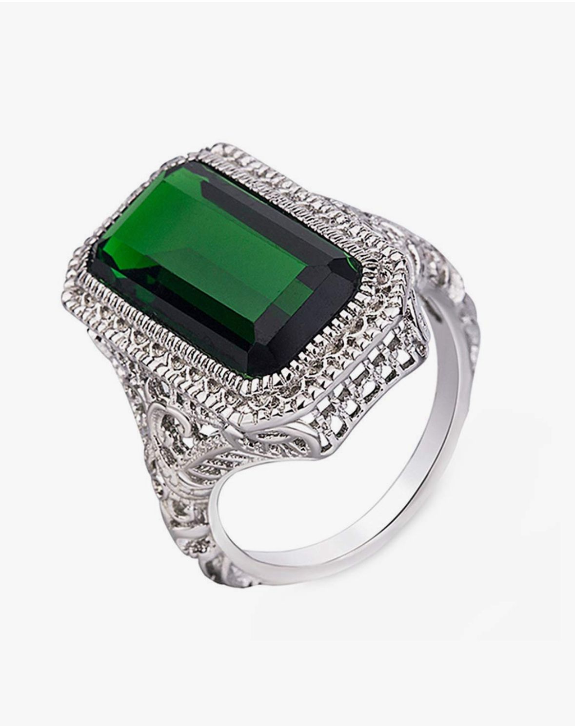 Pierścionek srebrny z ażurową oprawą i prostokątnym zielonym kryształem