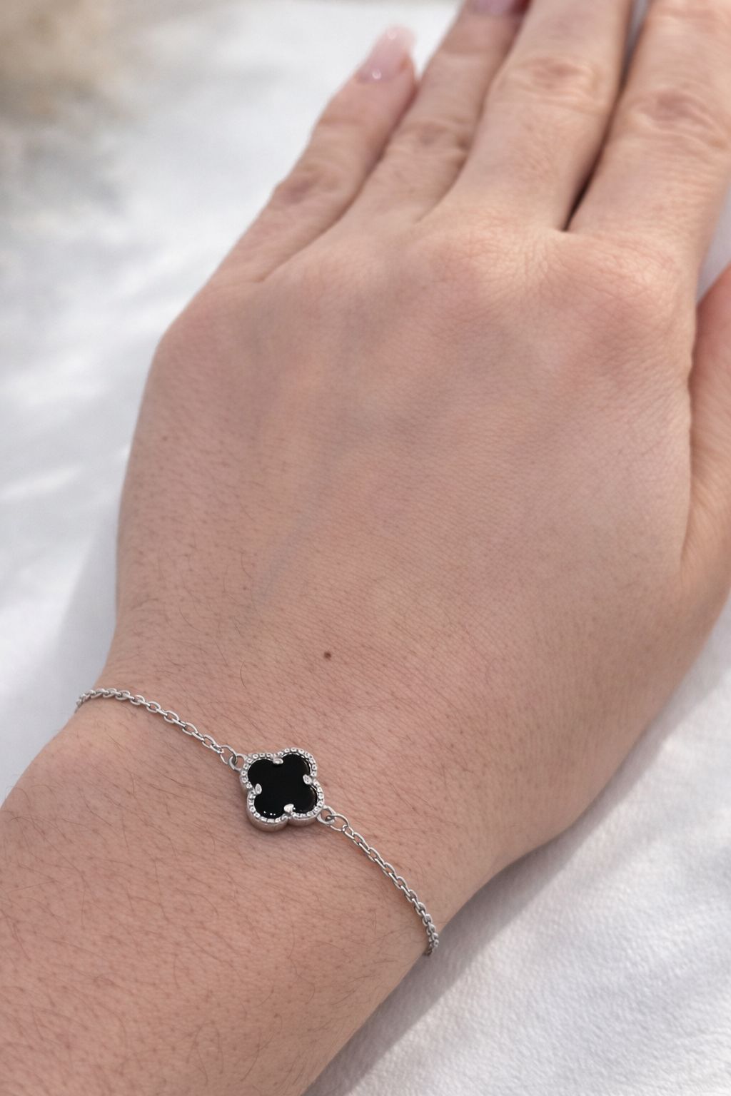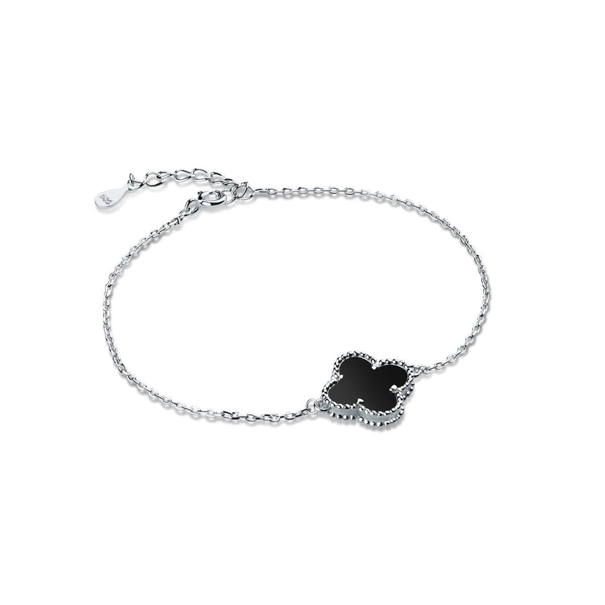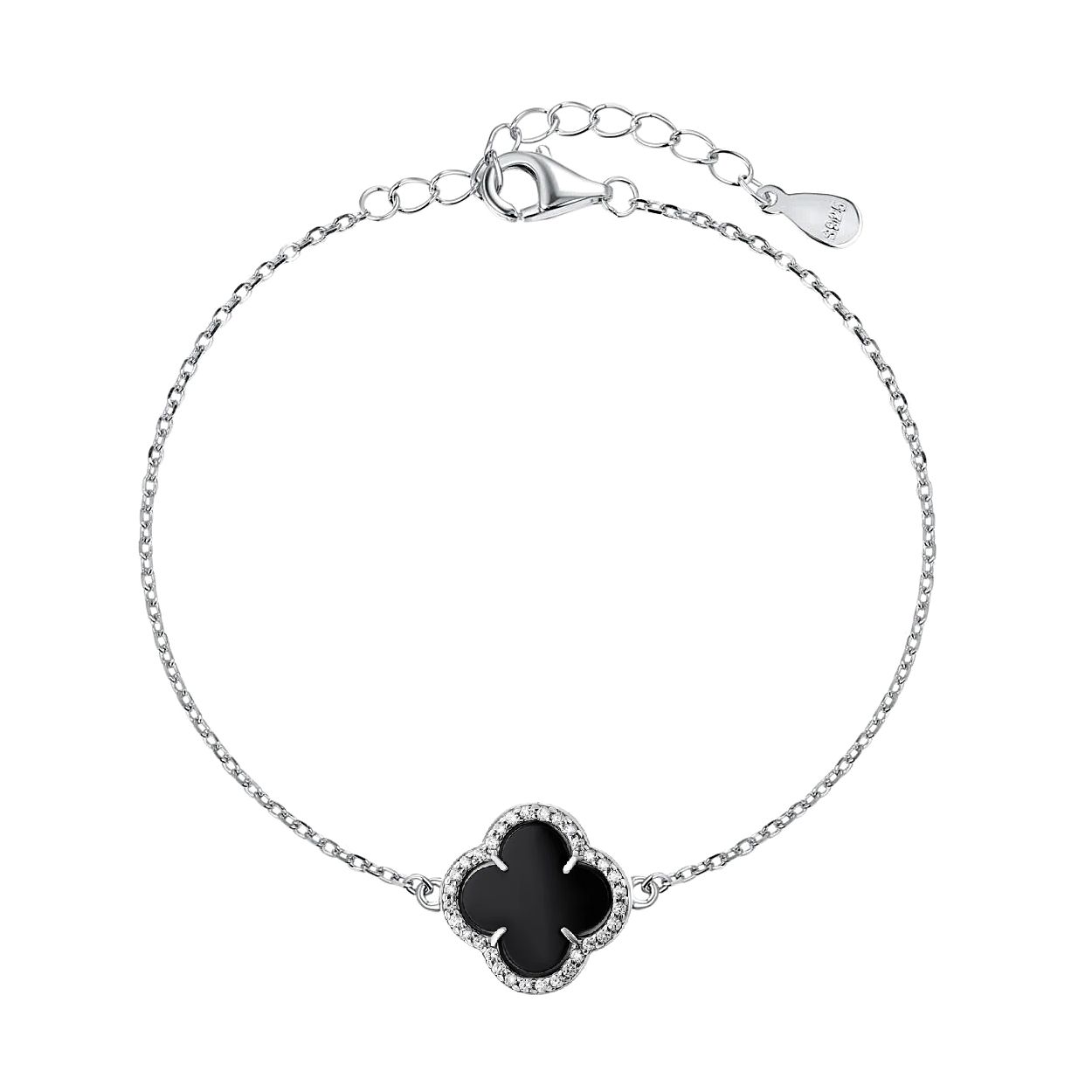 Elegancka bransoletka wykonana ze srebra próby 925, ozdobiona czarną koniczyną w dekoracyjnej oprawie. Delikatna i stylowa, sprawdzi się zarówno na co dzień, jak i jako elegancki dodatek na specjalne okazje.