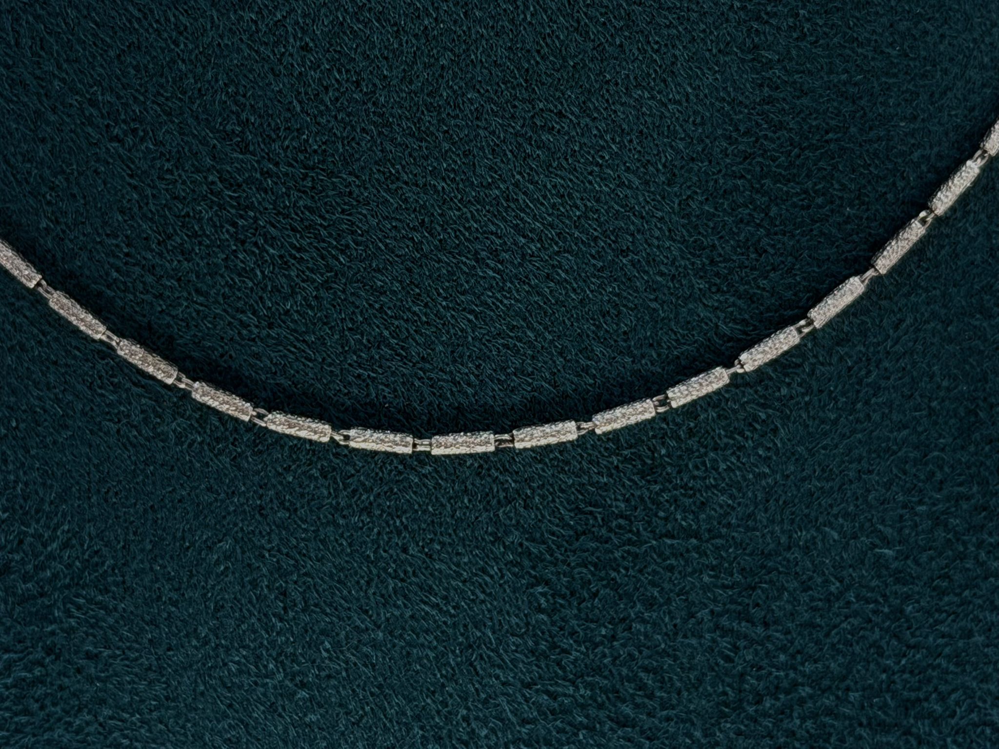 Elegancki srebrny łańcuszek z geometrycznymi, diamentowanymi ogniwami.